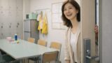 明るい光が差し込むコミュニティで、60代女性が笑顔で生き生きと働く様子