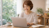 柔らかな光が差し込む窓辺のデスクで、ノートパソコンとノートを前に新しい学びに挑戦する60代女性の笑顔